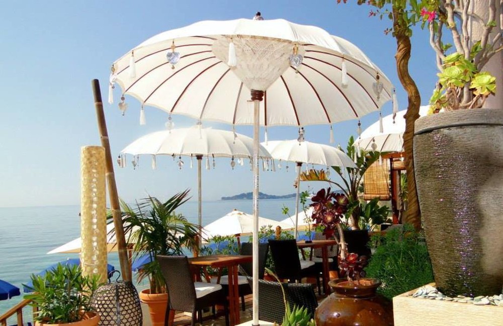 Décoration soignée et mer turquoise sur la plage privée Papaya Beach à Eze.